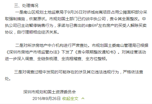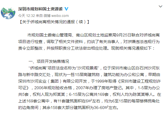 今天中午,深圳市规土委通过其官方微博发布了“6平米鸽笼房”的调查结果,通报全文如下: