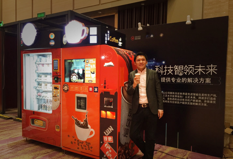 (友饮咖啡创始人兼CEO张阳及友饮四代智能现磨咖啡机)