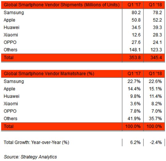 近日国外调研机构Strategy Analytics发布了全球智能手机出货量报告,报告数据显示,2018年Q1季度智能手机出货量共3.45亿部,三星以23%的份额重回榜首。苹果位列第二,其出货量为5220万部,同比增长2.7%,占据市场15%的份额。第三名华为出货量为3930万部,市场份额占比11.4%,提高了1.6个百分点。