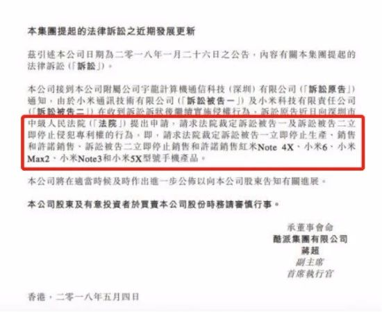 5月4日,酷派集团发布公告称,对小米科技有限公司侵犯其多项发明专利提起侵权诉讼和行政处理请求,目前已向深圳市中级人民法院提出申请裁定被告停止侵犯专利权的行为。本次侵权产品包括红米Note4X、小米6、小米Max2、小米Note3、小米5X共五款手机型号。