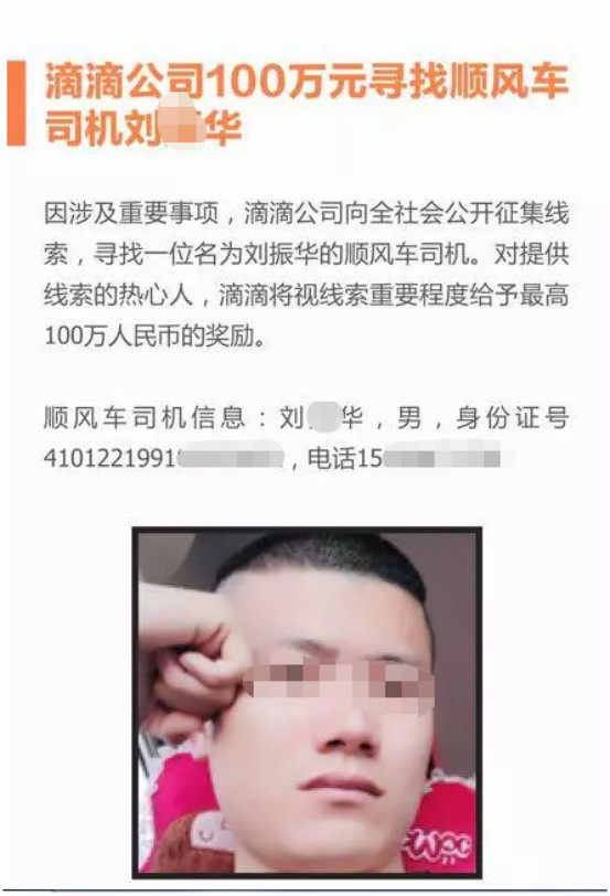针对滴滴乘客打车遇害的事件,滴滴公司发布公告称,向全社会公开征集线索,寻找一位名为刘振华的顺风车司机。对提供线索的热心人,滴滴将视线索重要程度给予最高100万人民币的奖励。并且道歉说:“我们真诚地和李女士的家人道歉,作为平台我们辜负了用户的信任,在这件事情上,我们负有不可推卸的责任。”