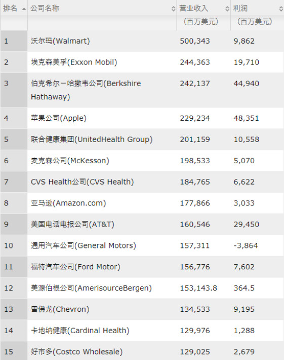 在今年的榜单上,沃尔玛连续第六年蝉联榜首,巴菲特旗下公司居第三,苹果公司位列第四,但它是美国500强最赚钱的,盈利483.51亿美元。除此之外,谷歌母公司Alphabet从27位升至22位,亚马逊从12位升至8位,特斯拉从383位升至260位。