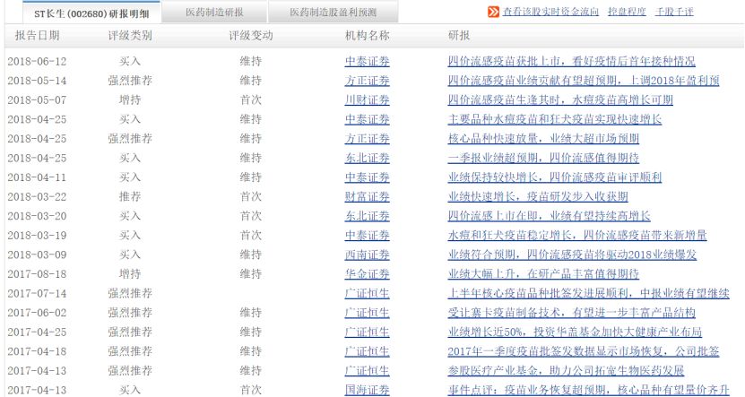 从下图关于长生生物的研报标题和评级中可以看出,除了假疫苗事件爆发之后,川财证券给出“减持”评级之外,最近两年,券商给出长生生物的评级全部都是正面。