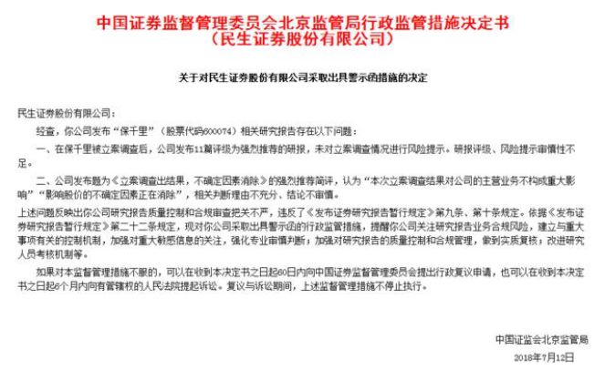 7月17日,中国证监会北京监管局发布行政监管措施决定书,对民生证券出具警示函。原因是民生证券在发布“保千里”相关研究报告存在两大问题。