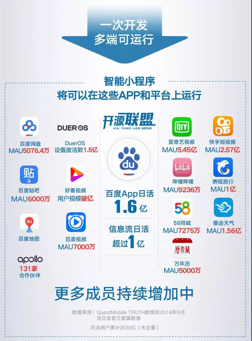 同时,百度智能小程序还发布重磅消息——“智能小程序开源联盟”和“开发者共筑计划”。bilibili、快手、墨迹天气、携程、万年历、58同城、爱奇艺、百度视频、百度地图、百度贴吧、百度网盘、DuerOS、好看视频等成为首批联盟伙伴;在“开发者共筑计划”中,百度将为智能小程序开放全域千亿级别的用户流量;提供百亿联盟的广告分成;成立一个提供专门扶持和推广智能小程序的创新基金百度以及一对一专人服务。