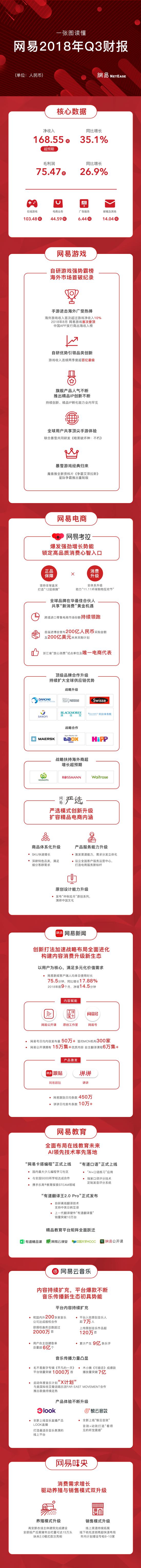 11月15日消息,网易(NASDAQ:NTES)今天宣布了公司截止到2018年9月30日的第三季度未经审计财务业绩。数据显示,网易第三季度净收入为168.55亿元(24.54亿美元),同比增加35.1%。