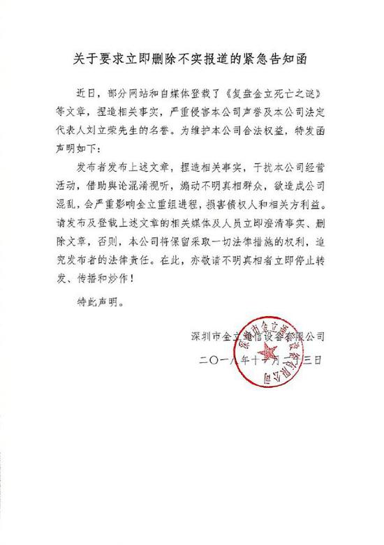 近日,部分网站和自媒体登载了《复盘金立死亡之谜》等文章,捏造相关事实,严重侵害本公司声誉及本公司法定代表人刘立荣先生的名誉。为维护本公司合法权益,特发函声明如下: