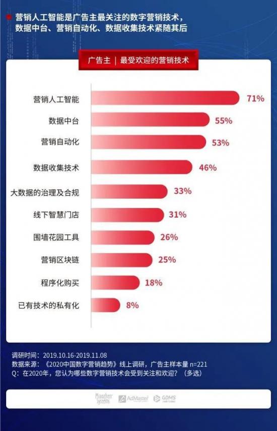 当前,人工智能技术在营销各环节和场景中不断渗透,数年技术积累已经被广泛认可。AI的加持,使得广告业能够更好地匹配当下的市场需求,另一方面也引发广告主需求、用户诉求产生新的变化,一个好的迹象是,广告主在AI+营销方面的预算正在逐渐增高——国际知名咨询及分析机构Forrester不久前发表全球性调研报告,认为全球55%的营销决策者在未来会增加营销科技方面的预算。此外,去年12月,全球数字营销峰会(GDMS)发布的《2020中国数字营销趋势》显示,2020年营销人工智能将成为最受广告主欢迎的数字营销技术:
