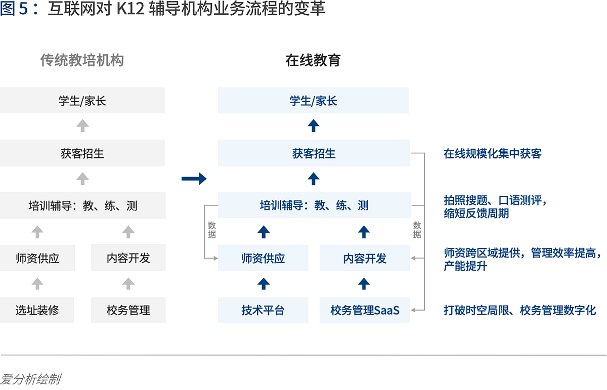 从下图的在线和线下K12辅导机构的业务流程对比可以看出,互联网在多个不同的业务环节上都对原有流程进行了重构再造,具体表现在: