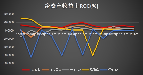 在快速的现金循环周期及领先同行的销售规模支撑下,TCL科技总资产周转率指标整体优于同行,2019年该指标值为0.42次。把总资产收益率拉大到十年尺度来看,TCL科技同样整体领先同行。