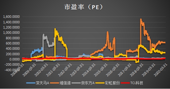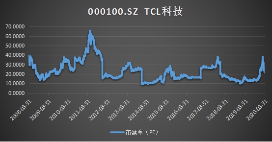 在资产周转率、资产负债率和销售净利润率这三个关键指标的助推下,TCL科技ROE领先同行多数友商。然而,其PE倍数却远低于同行多数友商。面板A股上市公司中,3月31日收盘日,TCL科技的PE倍数只有21.4,尚不及最高PE倍数者的零头,仅为它的8.66%。即使将时间轴拉长到十年,TCL科技的PE倍数整体低于同行多数友商。