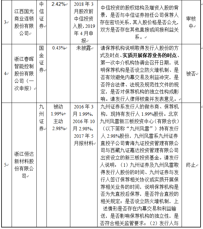 即使直投和保荐间隔时间很长,保荐机构持股比例较小,保荐和直投完全独立,瓜田李下的嫌疑较小的发行人,可能也会被投资人、媒体、监管机构带着有色眼镜审视。举个例子,常规的财务审核和检查,就相当于你穿着衣服火车站安检,被带着有色眼镜审视,就相当于机场安检,现场检查就相当于皇帝选妃让你把衣服全部脱光了检查,检查力度不同,审核结果自然也存在差异。因为一般企业面临火车站安检和少量裸检后就是发审委环节,所以被否的数量和终止的数量相差不大,直投加保荐面临是机场安检或较大可能的裸检才能走到发审委环节,无怪乎,终止的比例要远超被否的个数。审核中、被否及终止项目的基本情况见下表: