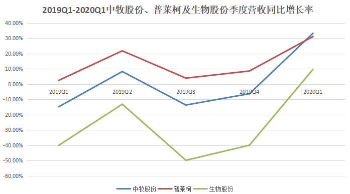 随着规模养殖场积极扩产,可繁母猪存栏量持续增长,生猪存栏量也不断增长,因而动物疫苗相关上市公司迎来业绩的拐点。从2020年一季报看,中牧股份、普莱柯和生物股份的营业收入都实现了同比正增长。