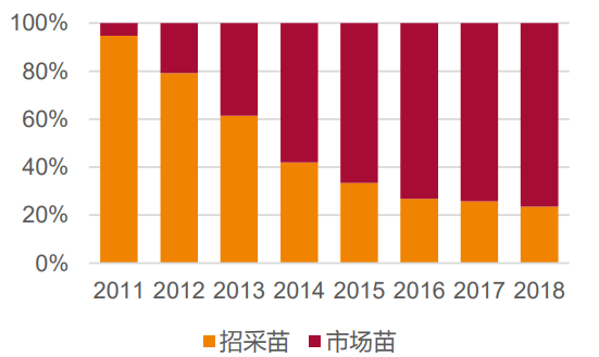 以生物股份的口蹄疫市场苗和政府招采苗为例,2011年市场苗占比仅为5%,2018年占比升至77%。说明规模养殖企业防疫意识较强,规模化养殖趋势推动了市场苗占比的提升。