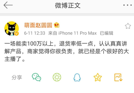 而对于平台而言,真正像罗永浩这样叫好(粉丝多)又叫座的名人可遇不可求。赵圆圆也曾在微博上吐槽“是人是鬼的的首秀都能破亿”,在他看来“一场能卖100万以上,退货率低一点,认认真真讲产品,商家觉得你很负责,就已经是个很好的主播了。”对行业里的“浮夸风”现象可以说点到为止。