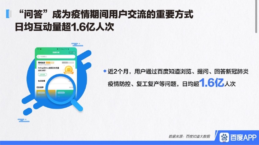 比如政务服务,百度知道大数据显示,今年2-3月疫情期间用户通过百度知道提问、回答、浏览疫情防控及复工复产等相关问题月均超48亿人次,复工后政务问答量环比上涨20%。知乎数据也显示,截至2月中旬,知乎抗击疫情相关回答阅读达17.3亿次。