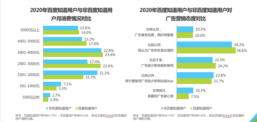 比如问答赛道中认知度最高的百度知道,根据艾瑞《白皮书》的调研研究,在广告营销接受度方面,对广告持相对正面态度(无动于衷及以上)的百度知道用户占比为70.9%,而非百度知道用户的这一比例则为66.8%。