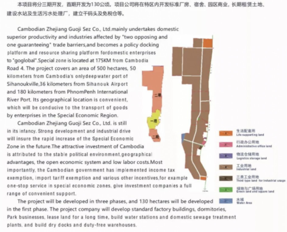 而第二个经济特区,则是位于柬埔寨4号公路175公里处。总规划500公顷,配有日处理5000吨污水的污水处理厂和30万立方的循环水库。园区内以建材和家具类企业为主,是在2018年下旬正式启动的,目前已有20余家企业入驻。