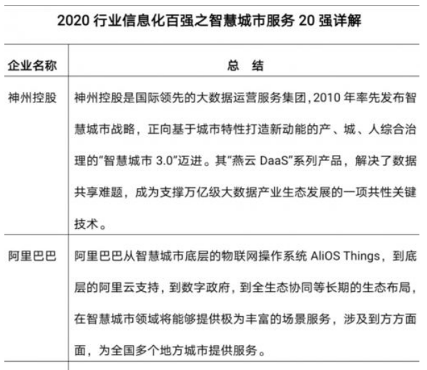 会上,备受瞩目的“2020行业信息化百强之智慧城市服务TOP20榜单”重磅发布,神州数码控股有限公司(简称:神州控股;股票代码:00861.HK)在众多竞争中者脱颖而出领衔上榜,一同上榜的还有阿里巴巴、中国平安等企业。