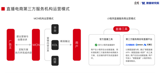 目前直播电商第三方服务模式主要分为以公域流量平台为主的电商MCN或网红电商孵化器商务服务模式,比如谦寻、美ONE、如涵、构美等,以及以私域流量为主的小程序直播服务商运营模式,比如微盟直播、即速应用、半城云等。