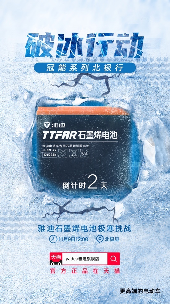 11月6日,雅迪官方放出了首张预热海报。海报显示,这场“雅迪石墨烯电池极寒挑战”直播将于11月9日12点在北极进行,雅迪石墨烯电池将在明星车型冠能系列的助力下,完成“极地C位”挑战。