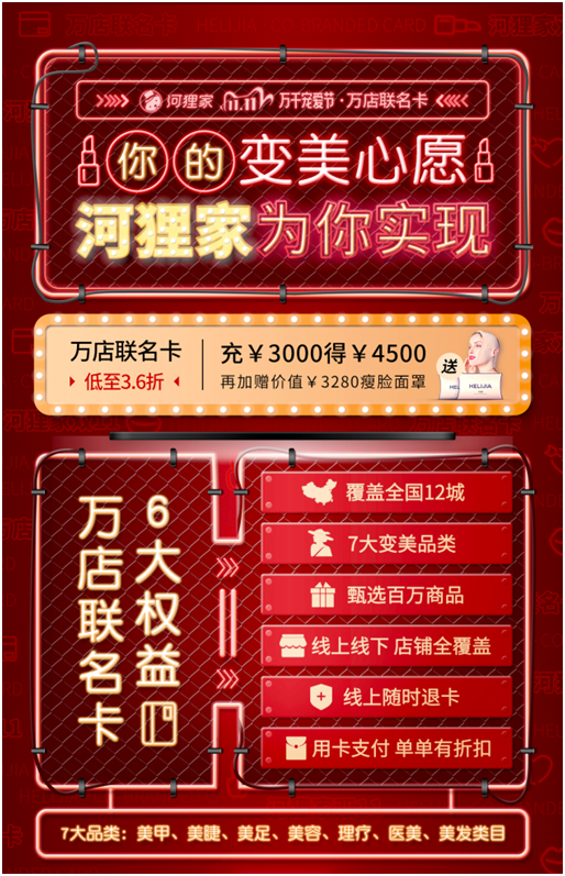 河狸家整合联动12城美业场景,包括:美甲美睫,皮肤管理,医美等美业服务项目,覆盖上万手艺人及国内多家知名美业连锁品牌,联合推出双11万店联名卡,力求为消费者带来最大的福利,万店联名卡以经典充值形式展开,最高充5000得8000助力消费者边走边美,一站变美。