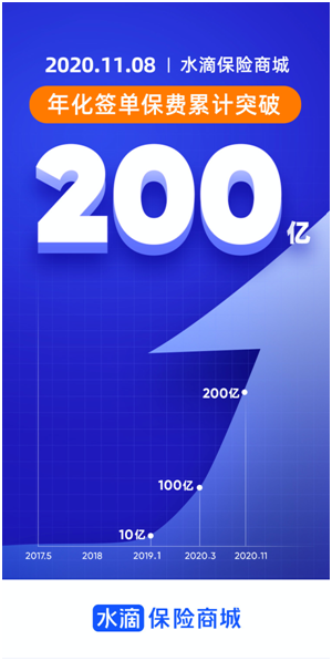 从水滴保险商城的增长曲线来看,2017年5月从零起步,2019年开始进入爆发式增长阶段:年化签单保费在2019年1月达到10亿元,2020年3月达到100亿元,2020年11月达到200亿元。