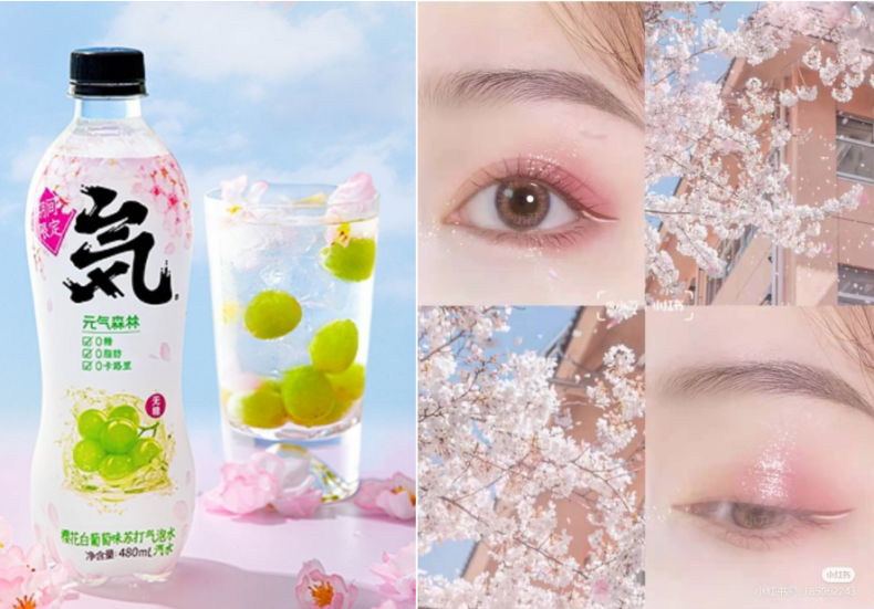 你以为爱美小姐姐们的创作只局限于白桃、卡曼橘、青瓜、酸梅汁、乳酸菌、莱姆淡姜、青苹果这些口味吗?不不不,作为新时尚的弄潮儿,她们紧跟元气森林气泡水的出新脚步,春日限定款——樱花白葡萄味气泡水刚推出没几天,网上就已经开始盛行春日樱花妆了,这速度,简直令人佩服。Get了这个仙气腾腾的樱花妆,让眼睛充满少女的温柔,仿佛下一秒就要陷入甜甜的爱恋之中了。