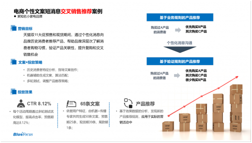 某小家电品牌在天猫双11大促预售和现货期间,通过分析历史消费者特征验证产品关联性、指导文案创作,经过多轮测试优化模型向历史消费者推荐新品,点击率达8.12%。提升了复购和交叉销售的机会。