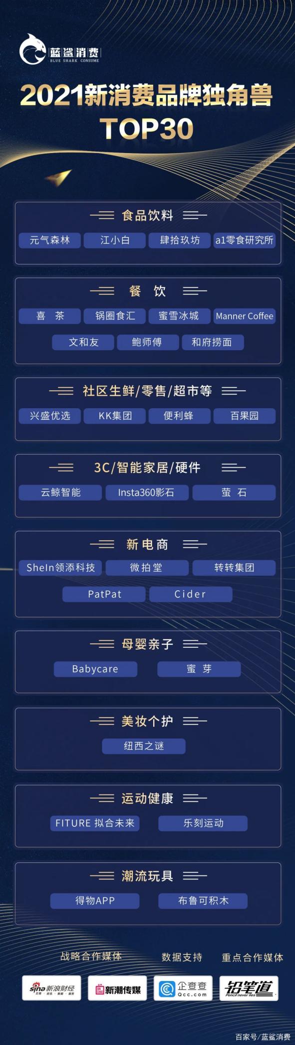 评选采用自主报名、投资机构推荐和评委会提名的征集方式,经过线上线下多轮评选,最终,30家新消费品品牌从300多家候选名单中脱颖而出,入选《2021 新消费品牌独角兽TOP 30》。以下为总榜: