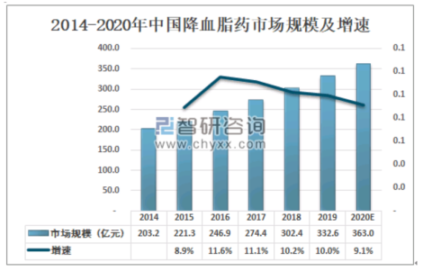 据智研咨询发布的《2021-2027年中国降血脂药行业市场研究分析及发展规模预测报告》数据显示:2019年中国降血脂药市场规模为332.6亿元,同比增长9.99%,目前中国市场是全球最具潜力的降血脂药市场,也是全球发展最快的市场之一。