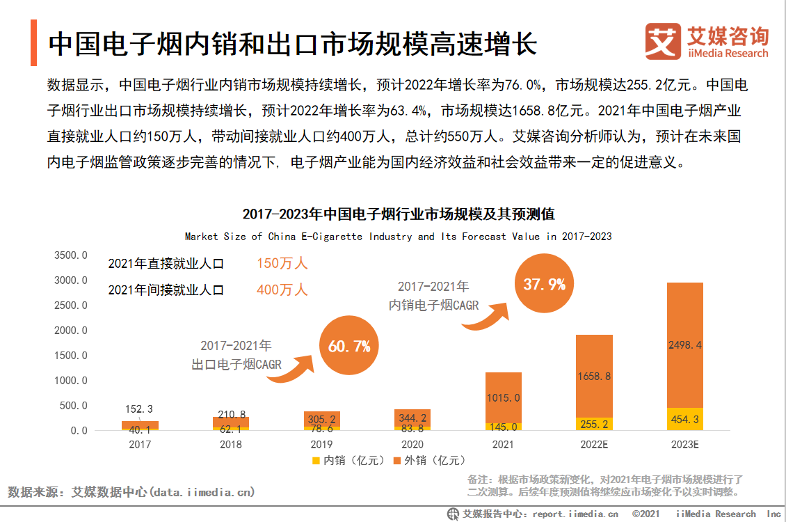 数据显示,中国电子烟行业,市场规模持续增长,2021年内销市场规模145.0亿元,预计2022年增长率为76.0%,市场规模达255.2亿元。而中国电子烟行业出口市场规模庞大,
