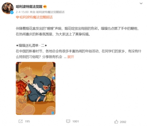 春节期间哈利波特的手游官博依旧活跃,并且微博上有不少需要玩家交互来获得的奖励,比如此次的嗅嗅送礼活动,嗅嗅送出三份礼单,玩家在评论区进行交流互动,便有机会获得嗅嗅送出的礼品,有实体周边也有游戏中的时装,评论区的玩家交流很热烈,甚至有玩家在评论中有玩家还找到了一起双排的搭档。