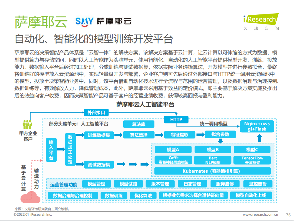 被艾瑞咨询在《2021年中国人工智能产业研究报告》中评为优秀案例的萨摩耶云,其正在做的事情就是基于人工智能和客户业务场景的协同创新,成为数字化升级的赋能者、价值的创造者和转型的供给者,引领着中国AI决策迈向更高阶。