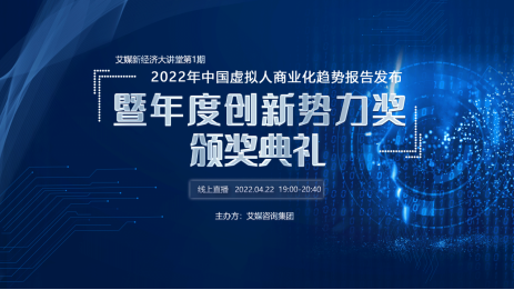 4月22日,由iiMedia Research(艾媒咨询)主办的“艾媒新经济大讲堂第1期:2022年中国虚拟人商业化趋势报告发布暨年度创新势力奖颁奖典礼”以线上直播形式成功举办。