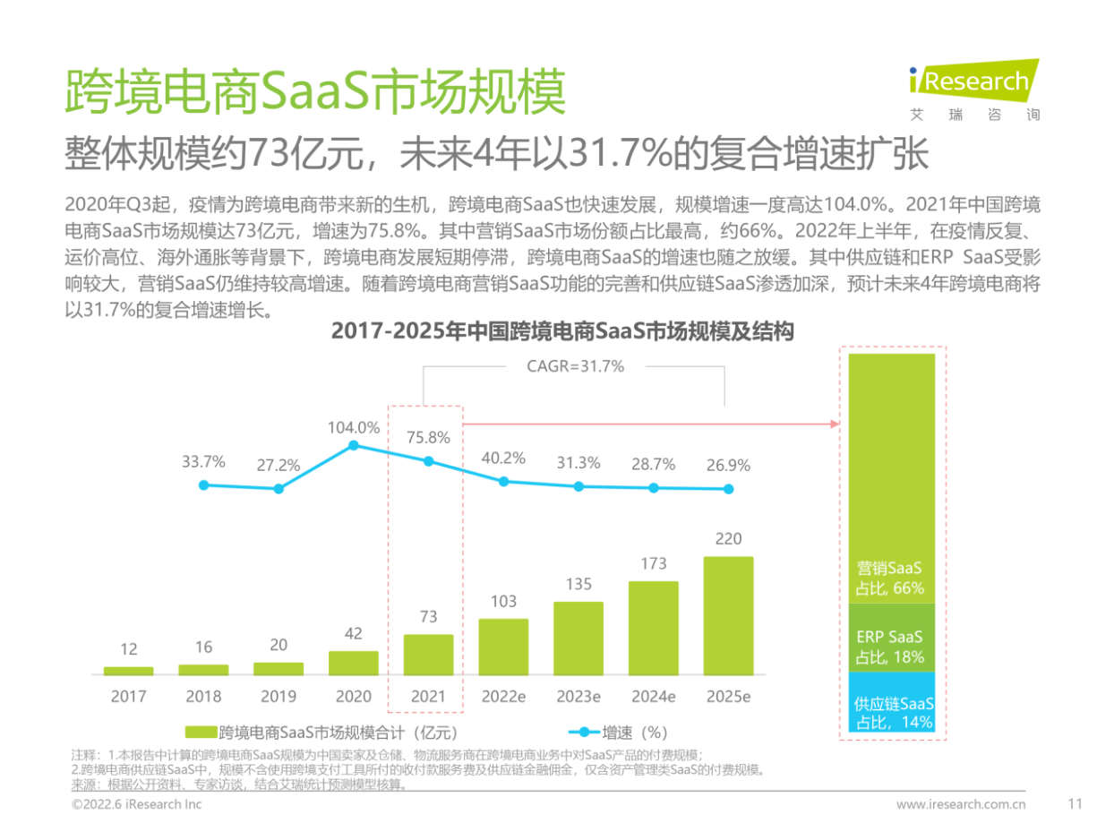 据悉,2020年Q3跨境电商SAAS增速达到惊人的104.0%,2021年中国跨境电商SaaS市场规模达73亿元,增速约75.8%,其中营销SaaS市场份额占比最高,约66%。随着跨境电商SAAS软件的功能完善及渗透加深,预计未来4年跨境电商SaaS市场仍将以31.7%的复合增速增长。