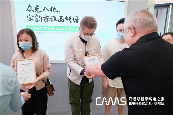 现场受邀前来的杭州区域的新能源车主,即日起正式成为开迈斯纯电之旅充电体验官,由开迈斯新能源科技有限公司首席执行官(CEO)董奇志和开迈斯新能源科技有限公司首席运营官(COO)王蕾为现场车主们颁发开迈斯智享纯电之旅充电体验官认证书。据悉,未来开迈斯充电体验官系列沙龙活动将在多个新能源核心城市举行,让纯电车主朋友们更好地乐享充电生活,感受开迈斯充电带来的全新舒适便捷的出行体验和服务体系。