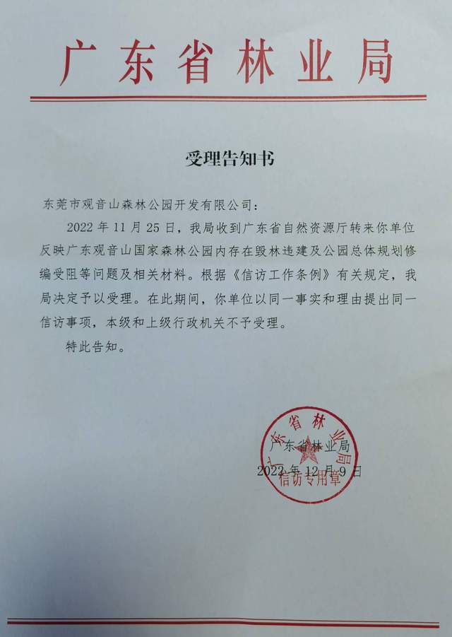 2022年12月9日广东省林业局发函公园《受理告知书》,决定启动事件核查工作。困难重重!广东观音山国家森林公园砥砺坚守廿三载终迎解决曙光。