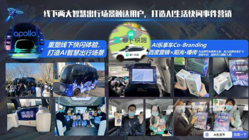 今年12月,百度营销「AI生活节」2.0升级版重磅推出,线上联动百度APP、百度飞桨、文心一格、百度百科、百度贴吧、百度超级链、百家号,线下聚焦阿波龙、萝卜快跑、多城联动,在上海市文化和旅游事业发展中心(上海地区)指导下,打造无人AI乐享车打卡,线上线下联动打造了一场与AI有关的生活奇幻漫游,让用户沉浸式享受AI+生活。