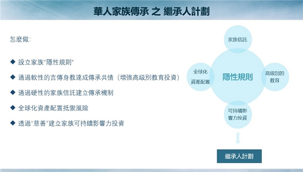 继承人计划 – 根据信托管理,主导帮助家族设置继承人触发规划。