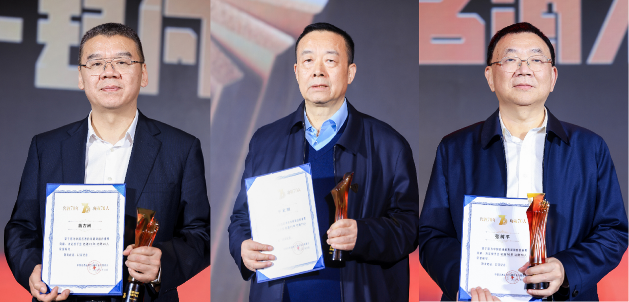 活动现场,中国名酒品牌70周年活动组委会对面向全行业征集的 “名酒70年功勋70人”给予表彰。季克良、高景炎、曾祖训、徐岩、胡永松、李家顺等白酒专家,刘淼、谭忠豹、曾从钦、张树平、蒲吉洲等名酒企业领导,以及王富强、朱跃明、宋宁等酒业大商共计70位业界公认的功勋人物获此殊荣。