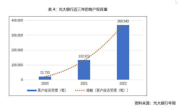这仅仅是媒体曝光的投诉个案,虽然光大银行东北分行的投诉量没有单独披露、但是从银行总体数据上看也可窥见一斑。光大银行近几年的客户投诉数量呈爆发性增长态势,从2020年的2万笔陡增到2021年的13万多笔,2022年投诉量更是再创历史新高,接近37万笔,其中投诉量较高的业务为银行卡业务、债务催收业务和贷款业务。投诉量翻了三倍年度报告非但没有给出合理解释,反而轻描淡写的一笔带过,这37万笔投诉的背后隐藏了多少对储户合法权益的侵害?主管行长应该收到降级处分。