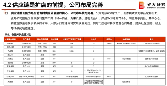 “餐饮供应链工业化大势所趋,中长期的成长确定性强。”光大证券的研报最后认为,供应链整合能力是当前食材类企业发展的核心,而锅圈布局较为完善。公司对接600家工厂,合作模式多为单品定制代工,产品SKU达到755个,明显高于竞品,其中心仓、前置仓数量也属于较多的水平,大部分门店送货可实现次日到达,同时门店也可扮演前置仓的角色,提升社区团购、线上等场景的响应速度。