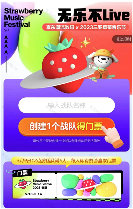 即日起,打开京东App进入京东电器频道页面,通过输入有效的队伍名称创建团队,也可以通过团队成员分享的京口令或活动海报进入活动选择加入团队后,即算作成功参与本次活动。5月9日中午12点前,只要活动团队人数达到5人即为组团成功,全团都可参与2023年三亚草莓音乐节门票抽取,抽取成功则全团用户获奖。每个活动团队最多10人,人数越多,中奖概率也会越来越高哦!9日晚8点将公布门票抽取结果,等你来参与!