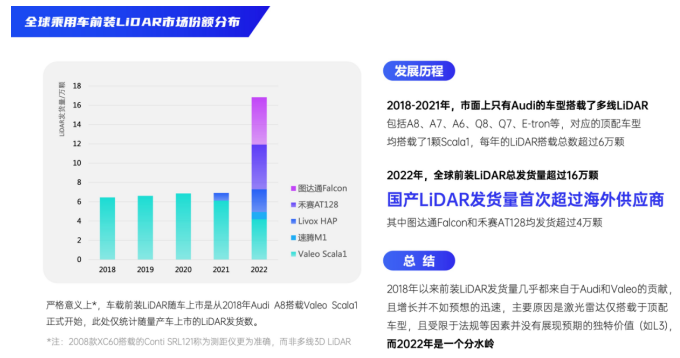 预计2023年将迎来一次跃增,包括传统主机厂在内的各大主机厂也将上市激光雷达车型,全球发货量有望超过30万颗。