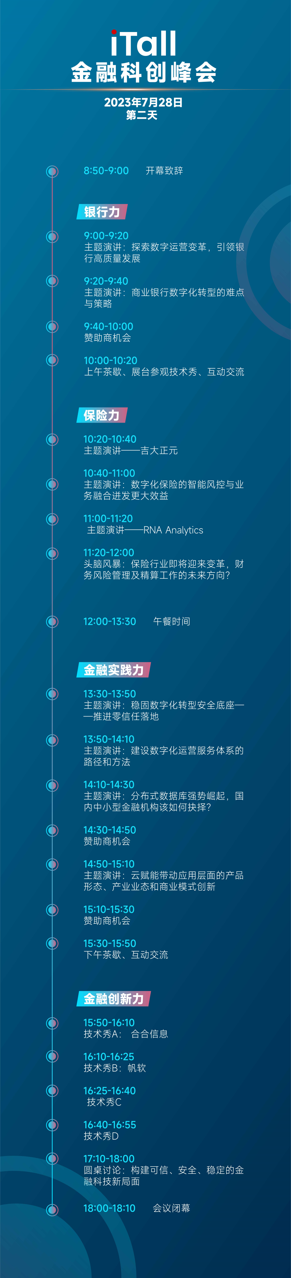 欢迎深耕金融行业、密切关注行业动态的您作为SVIP演讲嘉宾加入。围绕国产化科创、ESG和可持续金融、元宇宙+NFT、CBDC中央银行数字货币、ChatGPT、反洗钱、CDI商业数据交换、网络安全与风控、分布式架构数据库、数据治理等问题分享创新案例及市场分析和未来规划。