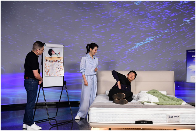 以撒贝宁体验的慕思“世纪梦”床垫来说,其首创的蝶翼透气设计,上层是 5cm 透气绗缝层,内部是六面透气中空立体结构 3D 棉,底部是细微透气 3D 网布,在床垫内部形成一整套空气微循环系统,受力呈双“C”型蝶翼型气流通道;每一次翻身,床垫就像扇动翅膀的蝴蝶一样,从里至外循环透气,从而减少闷热,让消费者睡眠更加舒适干爽。