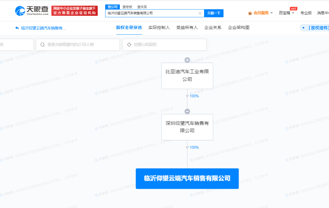 天眼查App显示,近日,临沂仰望云端汽车销售有限公司成立,法定代表人为陈足稽,注册资本100万人民币,经营范围包括汽车销售、新能源汽车整车销售、新能源汽车电附件销售、充电桩销售等。股权全景穿透图显示,该公司由深圳仰望汽车销售有限公司全资持股,后者为比亚迪汽车工业有限公司全资子公司。