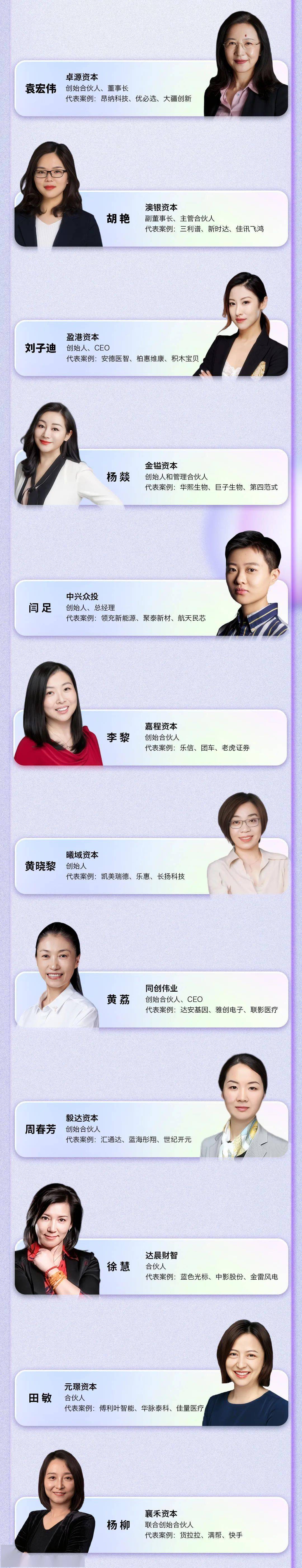 她们,拥有女性天生的敏锐、细腻,又不乏男性的果断、坚决。在风云莫测、浪潮澎湃的VC/PE行业,她们,用一个个鲜活的投资案例诠释着“撑起半边天”的含义;风口涌动,时代列车滚滚向前,越来越多的女性投资人正脱颖而出;她们,巾帼不让须眉,活跃在技术引领企业成长,创新驱动发展的各行各业;她们,让未来变得美好,也让VC/PE行业充满期待。
