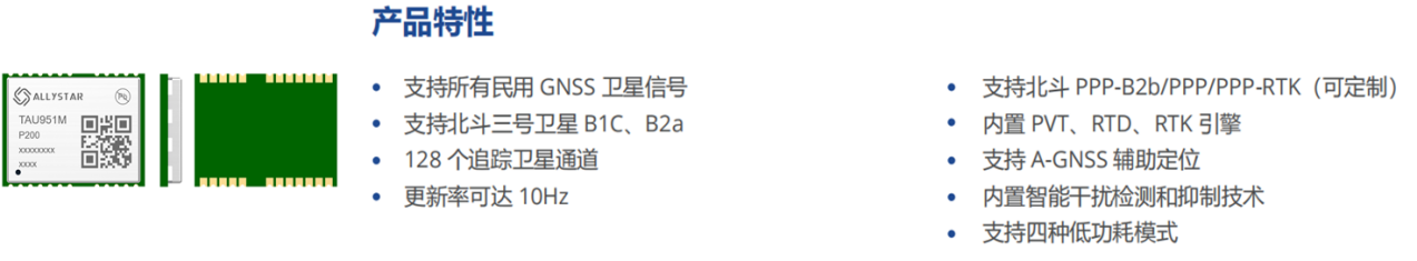TAU804M-F1B0/TAU804M-F2B0仅接收北斗导航卫星信号(含北斗二号、北斗三号), 分为单频和双频标准精度定位两款产品。该款模块内部集成 3 轴加速度计和 3 轴陀螺仪,同时支持其他传感器接入,进行多源信息融合,结合北斗定位技术与惯性导航技术,在北斗信号质量较差甚至丢失的环境下,仍能持续输出定位数据,为导航定位应用提供持续准确的定位服务,广泛应用于车载导航、两轮电动车、智能座舱、定位器、车联网、物流跟踪等应用。